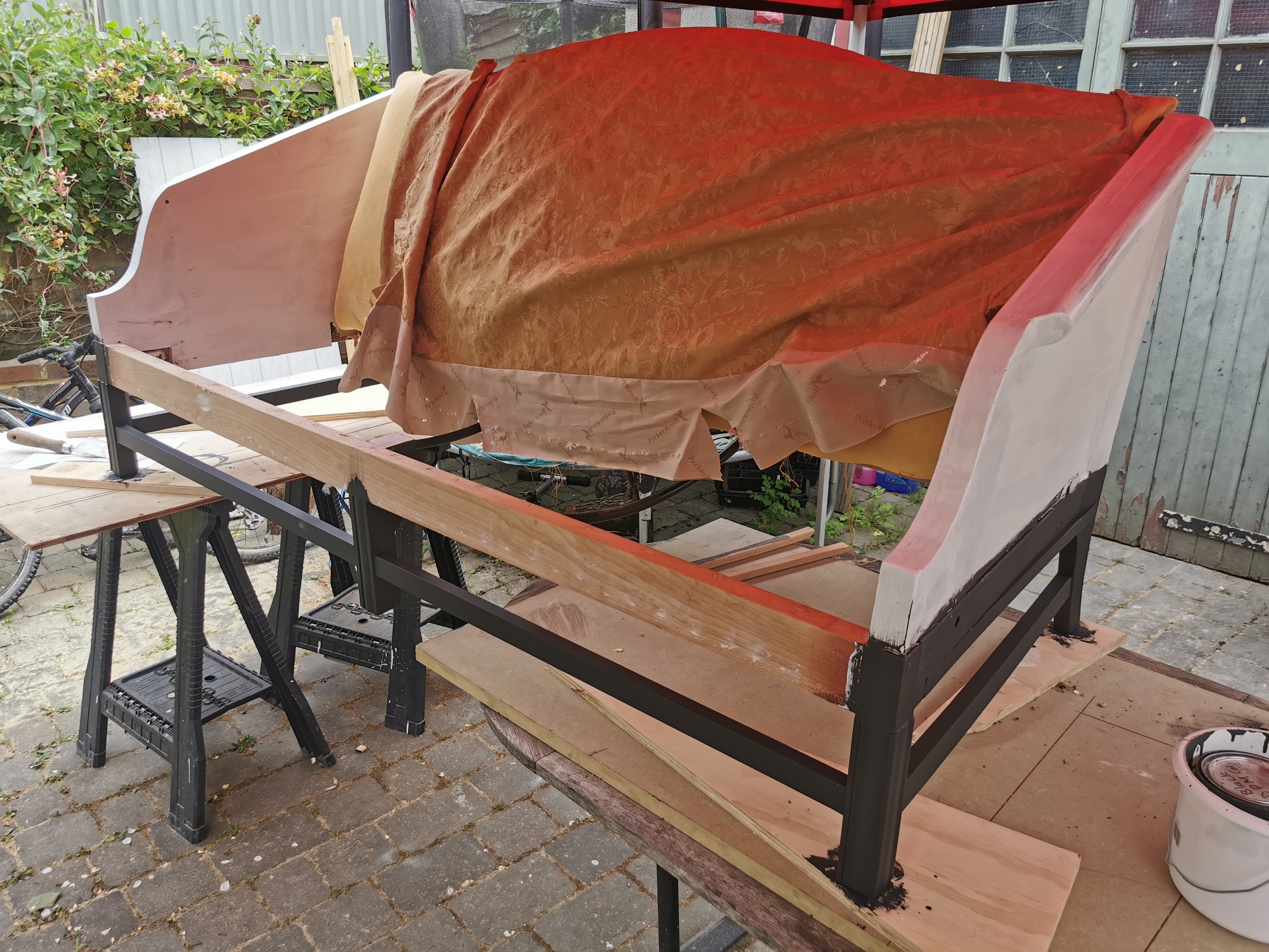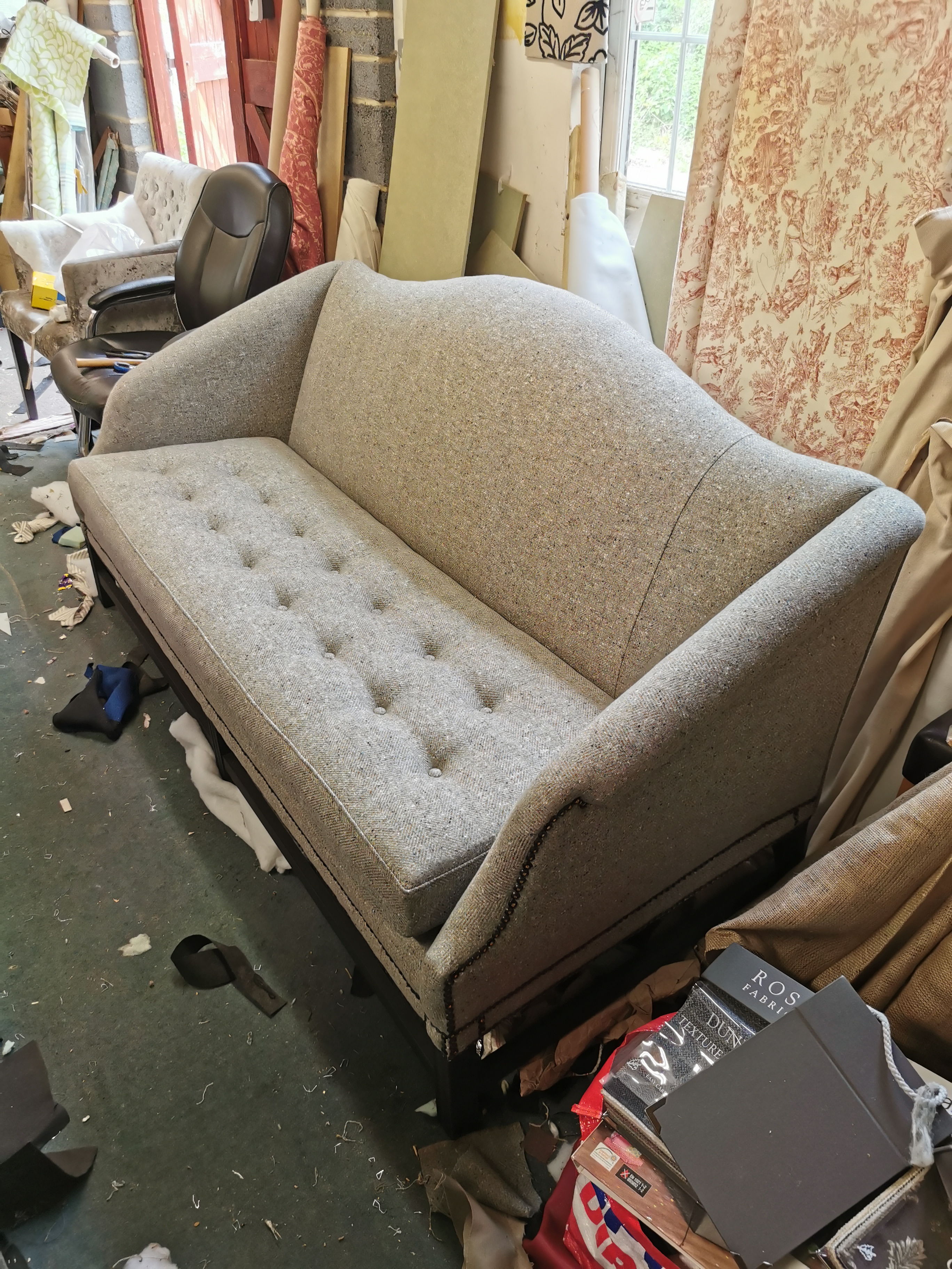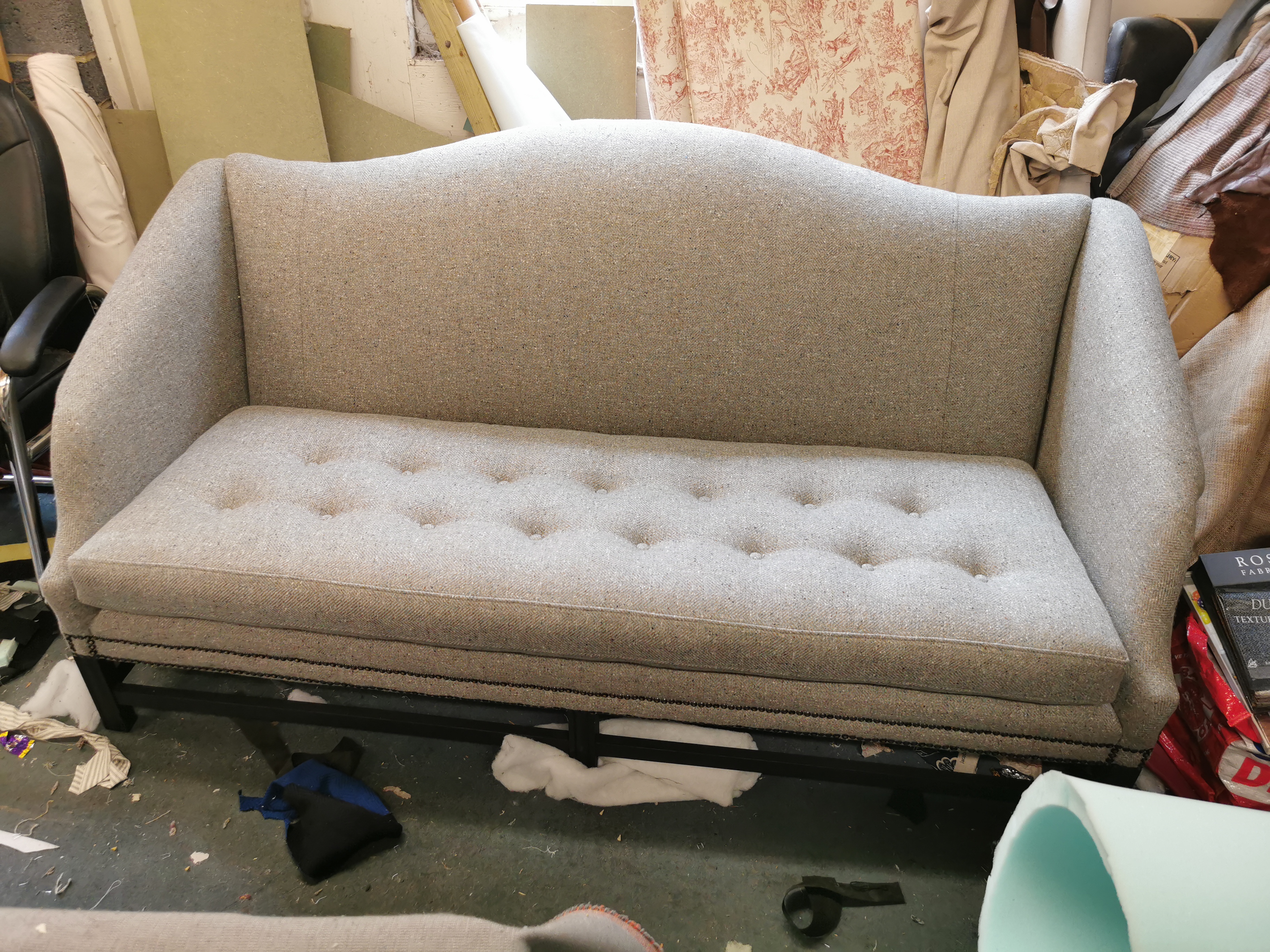 The beauty in situ, in her newly panelled room. From start to finish this sofa took 4 weeks as opposed to the less desirable 8-10 weeks and another piece of furniture rescued from landfill. This was a very challenging and enjoyable project.