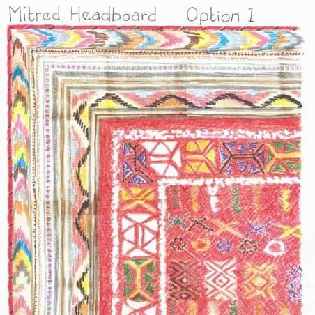 It was decided that the textile should be used for a super king size headboard that was extra tall so that it would be the focal point of the room. Unfortunately the textile wasn't quite big enough so a border design was dreamed up. Sometimes it can be difficult to translate an idea in the head to another person so on this occasion a couple of options were sketched up. Option one was the final choice.