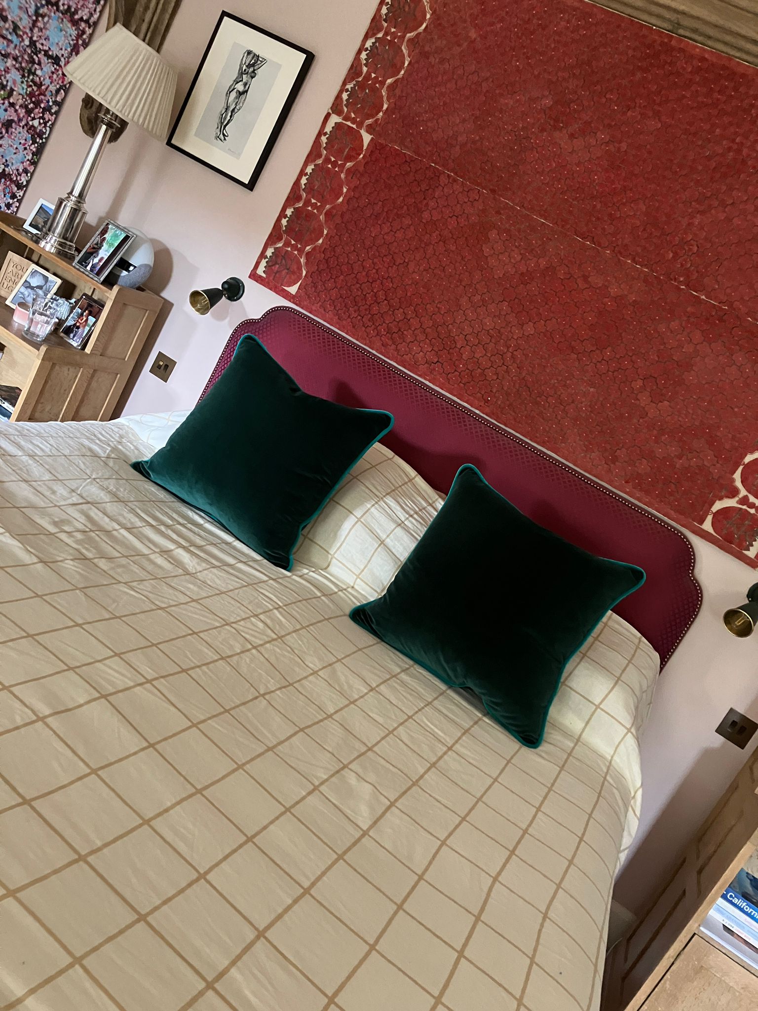 Close up of nailing detail and the bespoke extra large bed cushions made in velvet with contrast piping, picking up the colours of the textile hanging.