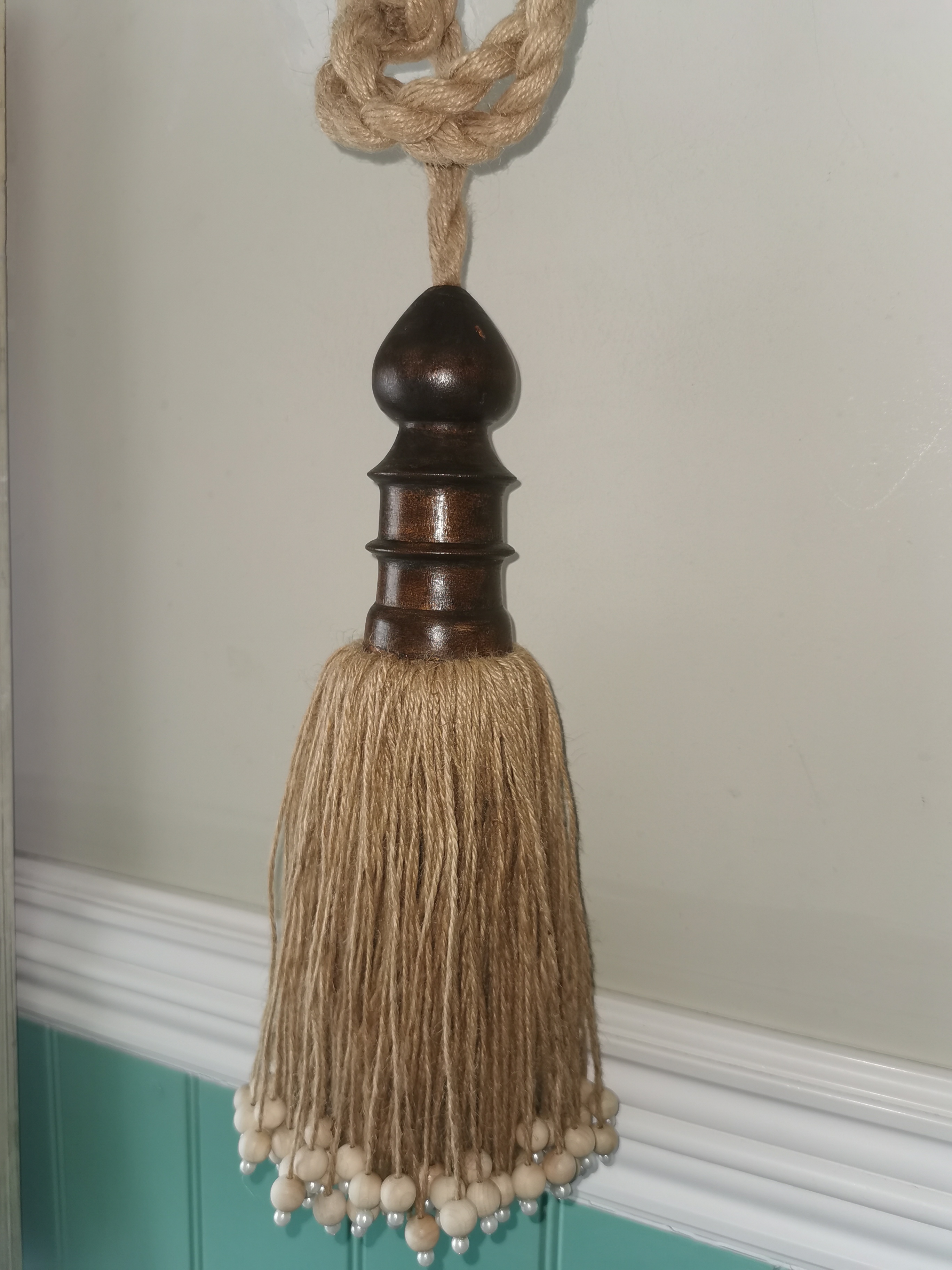 New tie backs were sourced. Often these can be a very expensive form of Passmenteri but the client didn't want to spend a fortune so we sourced a much cheaper option made of sisal, re-stained the tops to tie in with the new acorns on the sofa and added some beading detail to make them look a little more elegant.