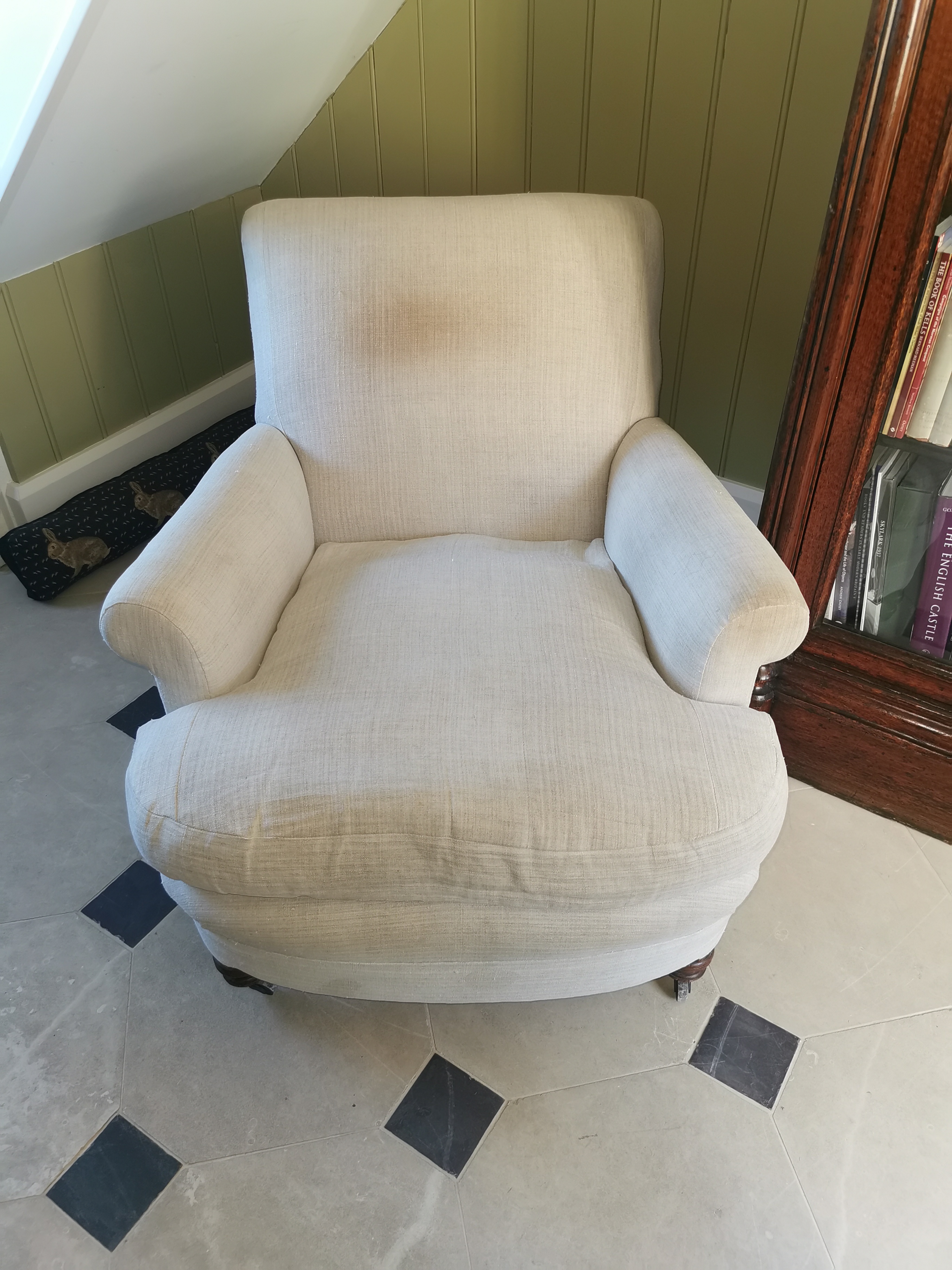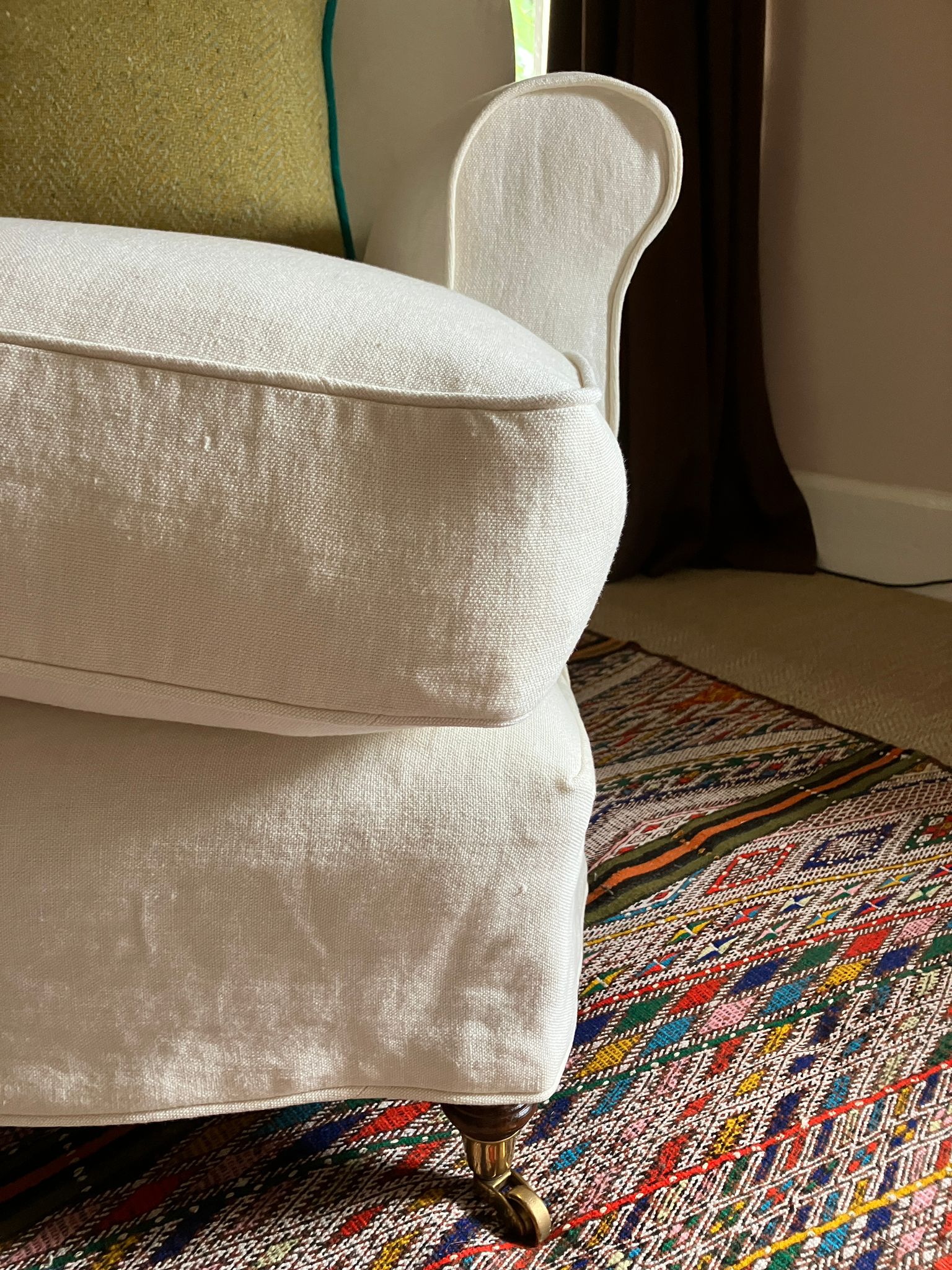 This pair of deep seated Bridgewater armchairs were in no need of repair or upholstering, they just no longer suited their new environment. The client wanted to keep the lovely chintz fabric but wanted something plainer so we opted for very simple off white linen loose covers, the simplest of details can make a huge impact.