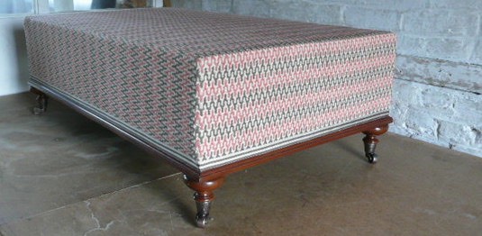 On this occasion the client wanted an ottoman that was flat topped that could also be used as a coffee table. There are attractive details with the wooden trim and carved bun feet on castors making this a a very adaptable piece.
